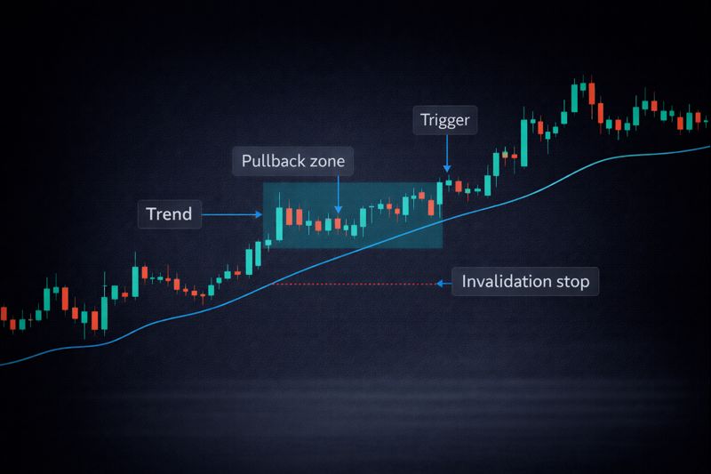 You only trade in the direction of a clear trend on a higher timeframe. You wait for price to pull back into a defined level/zone. You enter when price confirms with a reclaim/close back in the trend direction. You place your stop beyond the level that invalidates the idea.