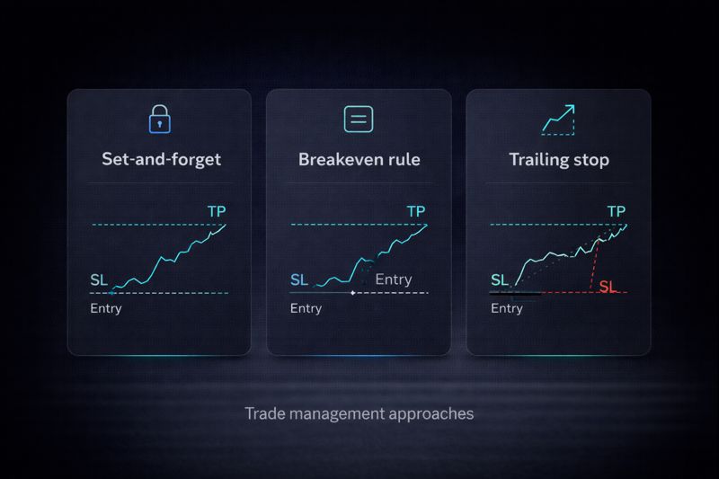 Trade management rules (set-and-forget / BE / trailing):
