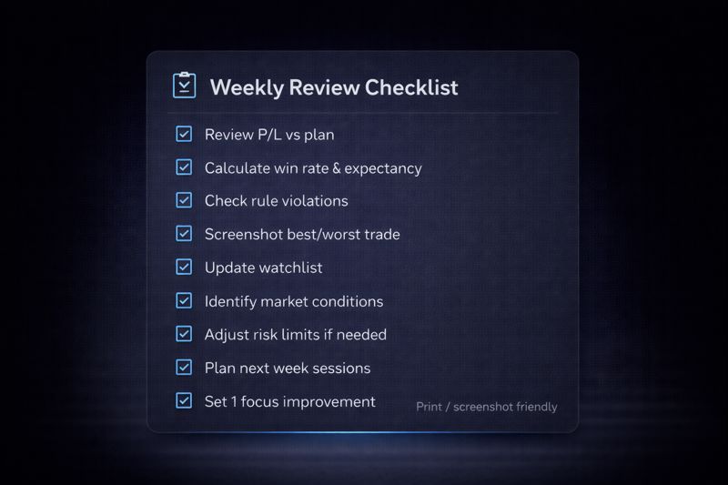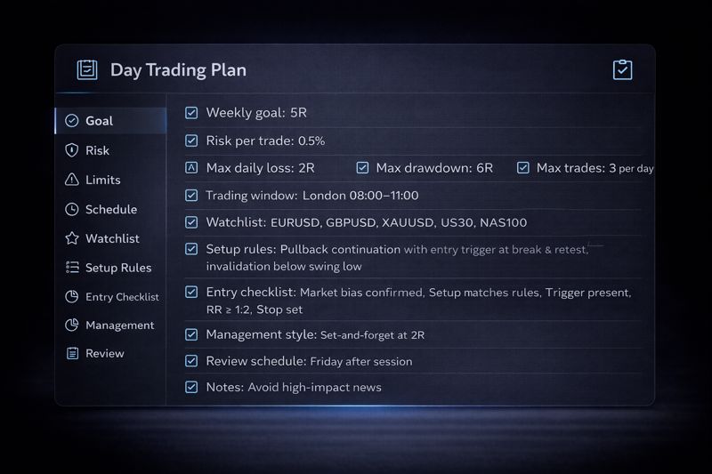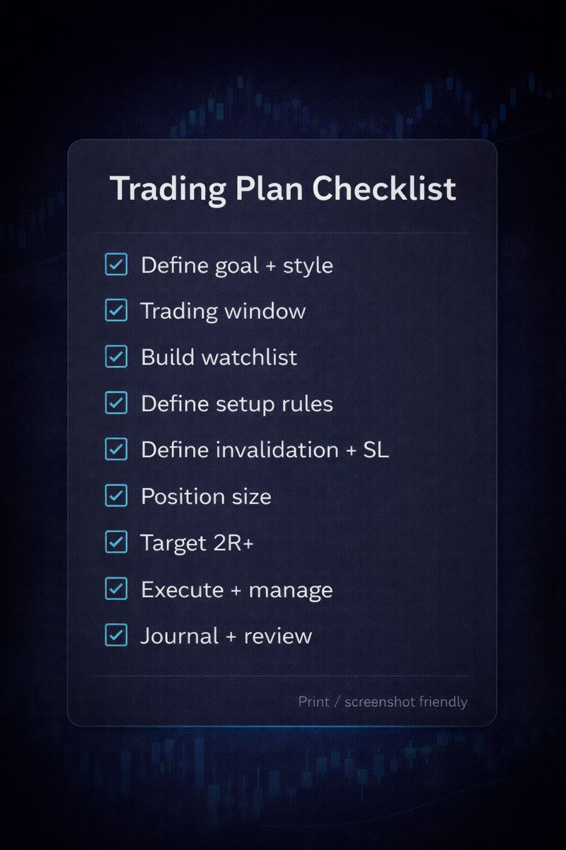 A trading plan is a written set of rules that tells you what you trade, when you enter/exit, how much you risk, and how you review performance. This guide walks you through building a complete plan in 10 steps, then gives you a copy/paste template and two filled examples (day trading + swing trading).